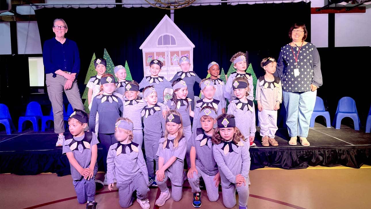 The sweetest family of hawks delighted the audience this week, as our youngest students took the stage! Dressed in fabulous feathers, pre-k students brought to life a heartwarming story about a family of hawks who live in the Pine Grove. When winter’s chill sets in, they decide to try life as snow birds, seeking warmth in distant lands. Though happy with their warm and lovely destinations, they soon realize how deeply they miss their home at DCD and dream of returning. With the arrival of spring, they journey back, only to discover their beloved Lowell Center reduced to a pile of rubble. They quickly learn, however, of the new, glorious theater being constructed, and our family of hawks, overjoyed, come together to help build the new theater with great teamwork and determination!